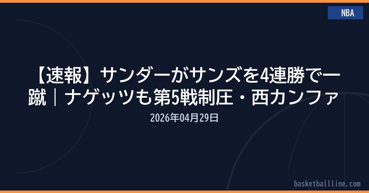 2026年NBAプレーオフ西カンファレンス1回戦。オクラホマシティ・サンダーがフェニックス・サンズをスイープ(4連勝)で撃破。デンバー・ナゲッツも第5戦を制し、シリーズの主導権を完全に握った。
